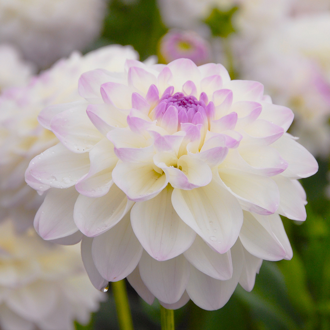 Ball dahlias are very popular because of their fantastic, perfectly rounded flowers on strong stems. Especially the dahlia Eveline enjoys great popularity every year because of its beautiful white ball flower with a small delicate lilac heart inside the flower. The dahlia Eveline gives beautiful ball-shaped flowers every year if you have kept the dahlia tubers frost-free, cool and dry during the winter. Ball dahlias are reliable suppliers of symmetrical flowers in your garden. The dahlia tuber Eveline grows to about 100 cm high and flowers continuously from summer until the first frost. It gives so many flowers that you can easily place many of them as cut flowers in a vase in your home.