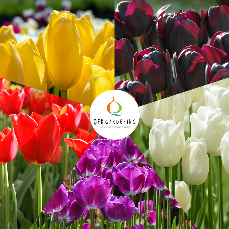 This tulip bulb collection "Mondriaan" is inspired by the colouring of the works of art by the Dutch painter Piet Mondriaan (1872-1944). He became famous for his colour-intensive, abstract paintings, which are partly reminiscent of the luminous tulip fields. Enjoy this colourful ensemble in your garden! This flower bulb mix consists of tulips of different varieties. You will find coordinated Darwin hybrids and also single, late-flowering tulips in this flower bulb mix. Place this colourful tulip bulb mix in a spot in full sun or partial shade. The flowering time of the mixed tulips will be between April and May and the flower colours are as mixed as the tulip types. The growth height is uniformly between 40 and 60 cm. This makes it possible to achieve an even garden picture, similar to a Mondriaan painting. For the best effect, we recommend planting approximately 60 tulip bulbs per m². Enjoy these amazing spring flowers in your garden or as cut flowers in your home.