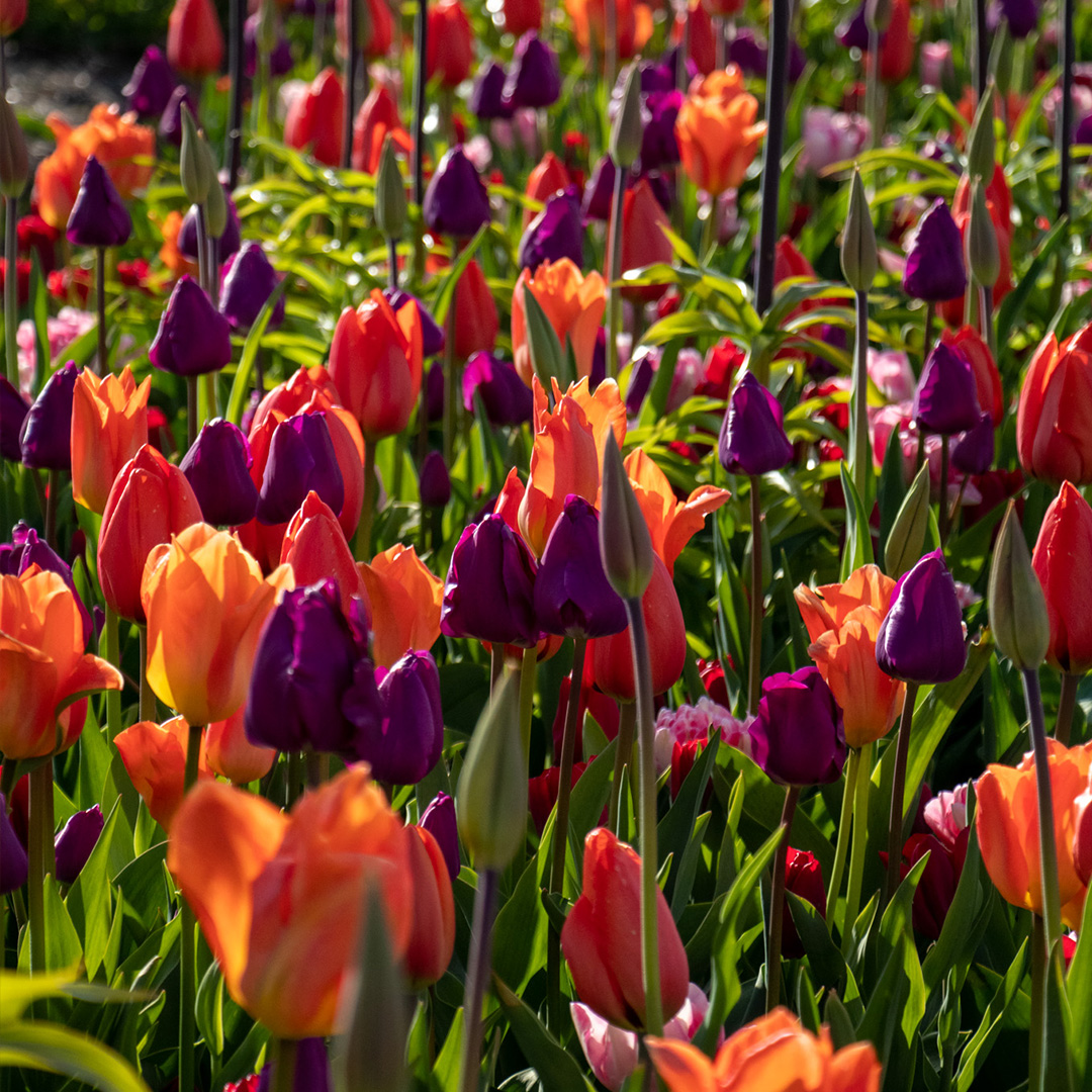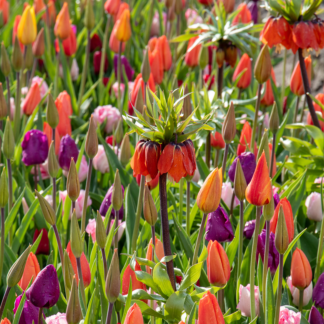 This beautiful mix of tulips and fritillarias combines warm shades of fiery orange, sunny yellow, deep red, and soft pinks and purples. The result is a vibrant color palette that creates a spectacular display of flowers from early spring until late into the flowering season.