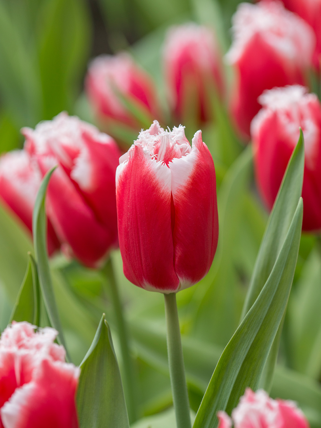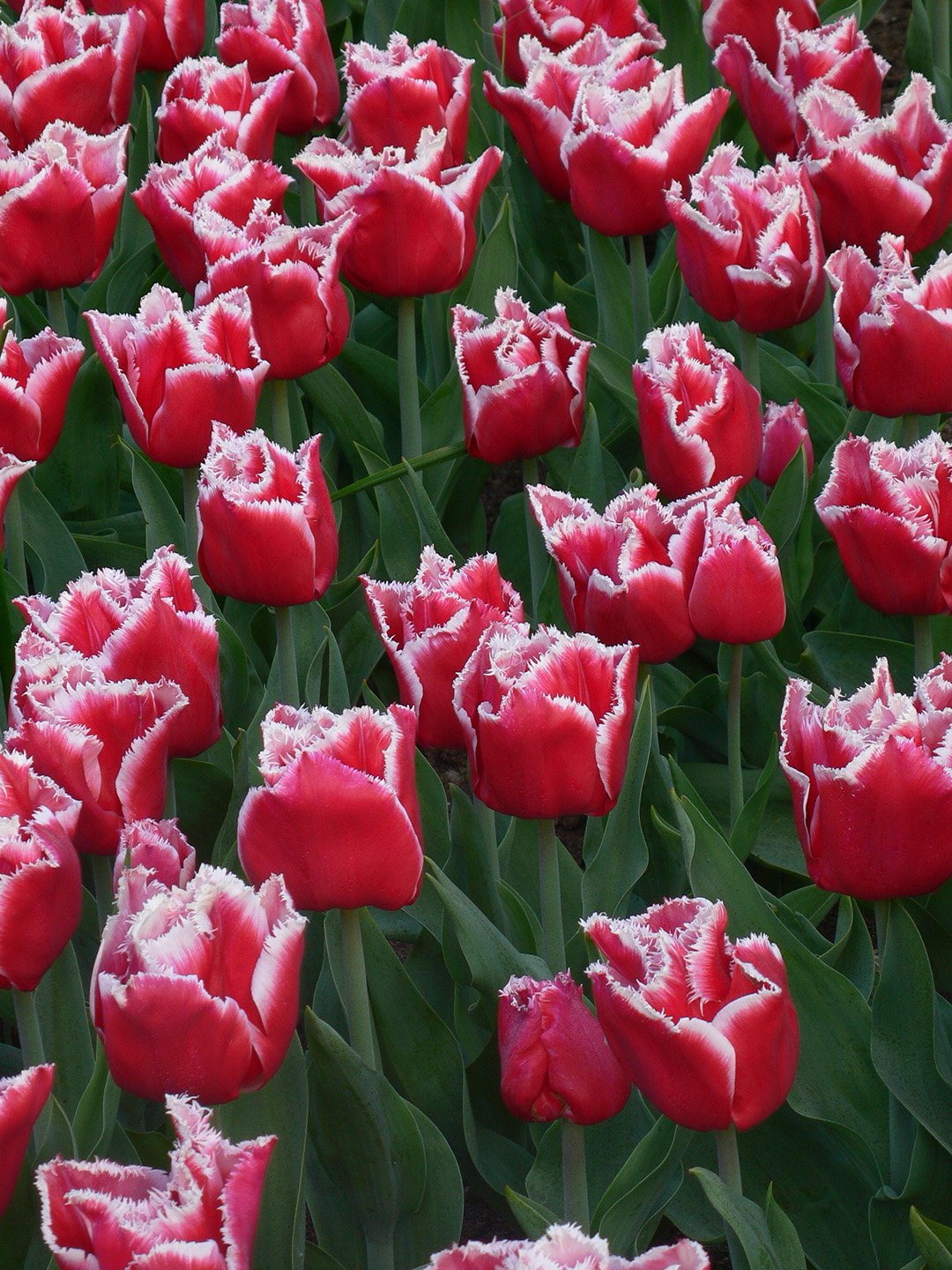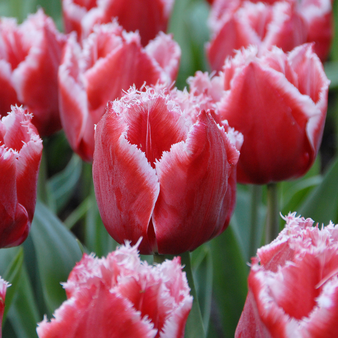 The colour of the flower of the Canasta tulip bulb is red with a white edge. The edge has a serration. The heart is white, the pistil is green and the stamens are black. The flower stands on a short, sturdy stem. They keep well and flower for a long time. The flowers all grow to about the same length. They look nice at the front of the border. Canasta tulip bulbs also do very well in a pot or container. One of the most important rules is: make sure they are well drained because tulip bulbs cannot stand too much moisture.