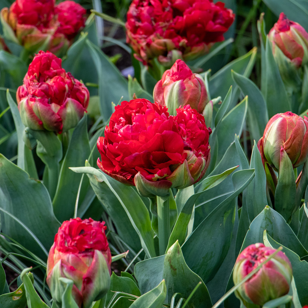 Tulip Ice Cream Strawberry, a striking variety because the flower really resembles an ice cream. The outer leaves are greenish-red, the leaves inside are green and the centre is completely filled with bright red leaves. There are so many leaves in the flower that they are pushed up and come out. The tulip has large flowers and a long flowering period. This beautiful double tulip will really bring your flower beds, borders or containers to life with its gorgeous colours.