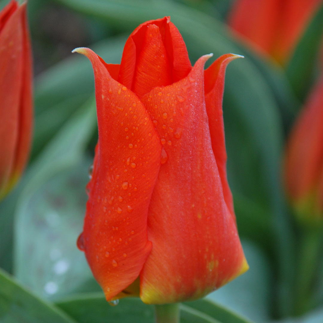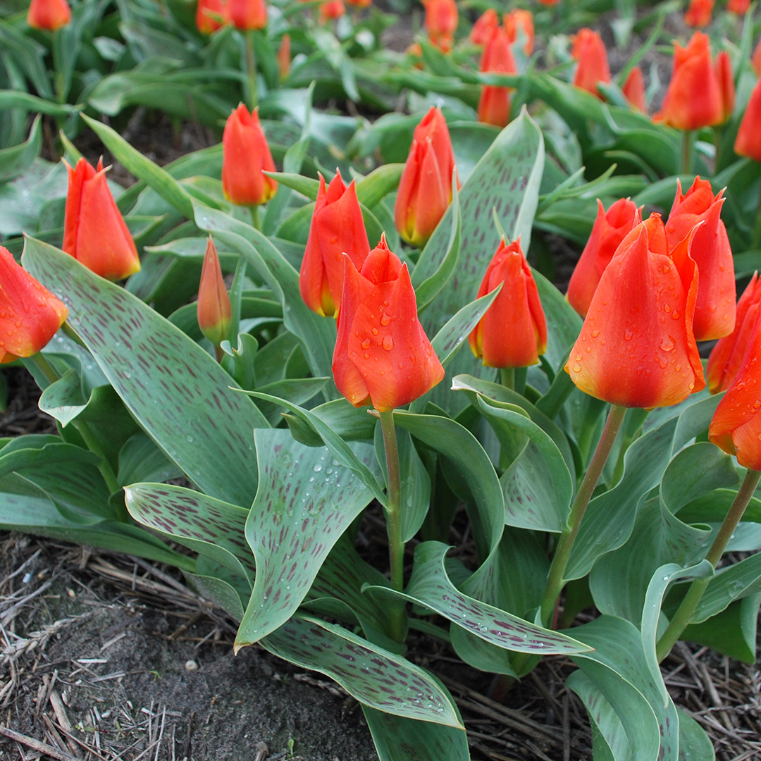 Miramare is a beautiful orange tulip that blooms in all weathers. The low-growing Miramare tulip is a charming variety that produces large, brightly coloured orange flowers. Up to thirty centimetres tall, the sweet-smelling Miramare tulip is ideal for planting along paths or in groups. It looks great in a pot on your balcony or terrace. The pointed petals forming exceptionally large buds open wide on sunny days and remain closed in the form of teardrop-shaped heads on cloudy days. The beautiful Miramare tulip delights not only with its flowers, but also with leaves. Those broad, wavy, greyish leaves are decorated with purple markings arranged in an intricate pattern. This makes this plant very graceful not only in the flowering period.