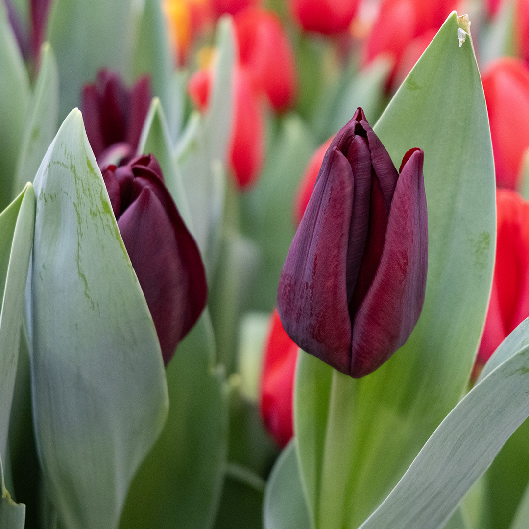 Plant the dark Toendra among white daffodils or soft pink tulips. The contrast makes the dark color truly stand out and instantly gives your garden a designer look.