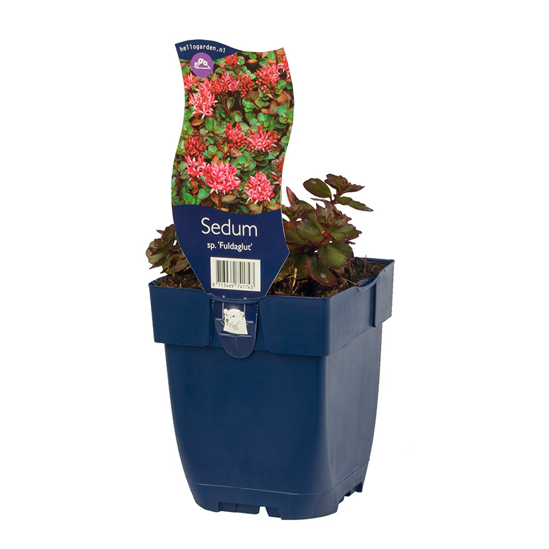 This beautiful garden plant is the Sedum Spur. Fulda glow. The beautiful blossoms look like a bright red carpet, which you will enjoy for a long time. A great ground cover that stays evergreen and is great for rock gardens or for filling in gaps. This beauty prefers a sunny spot with well-drained soil. It also attracts butterflies and bees with its small, star-shaped flowers in summer.